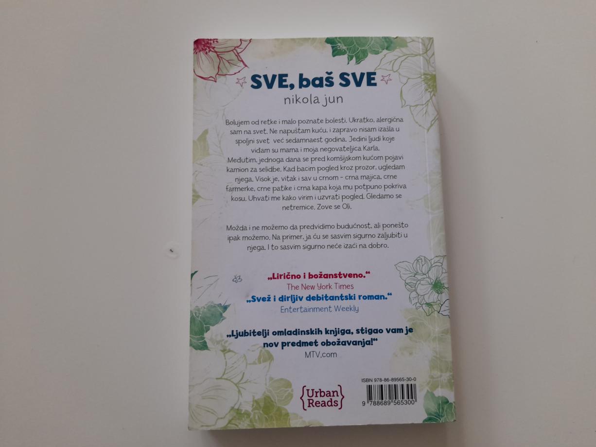 Bolujem od retke i malo poznate bolesti. Ukratko, alergična sam na svet. Ne napuštam kuću, i zapravo nisam izašla u spoljni svet već sedamnaest godina. Jedini ljudi koje viđam su mama i moja negovateljica Karla.