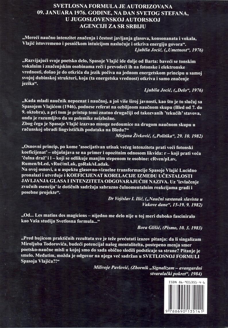 U ovoj knjizi su izloženi rezultati višegodišnjih istraživanja zasnovanih na tanano energetskoj prirodi Svetlosne formule, koja je matematički obrazac za izračunavanje energija, kojima su predstave o imenovanim pojavama "utisnute" u našu svest. Ispitivanja su pokazala da je ova formula, izgleda, prirodni ključ, kojim se proizvoljna tumačenja o nekim tajanstvenim duhovnim pojavama mogu znatnim delom objasniti zakonitostima elektromagnetnog polja, koje je verovatno podloga još tananijeg tkiva našega uma.