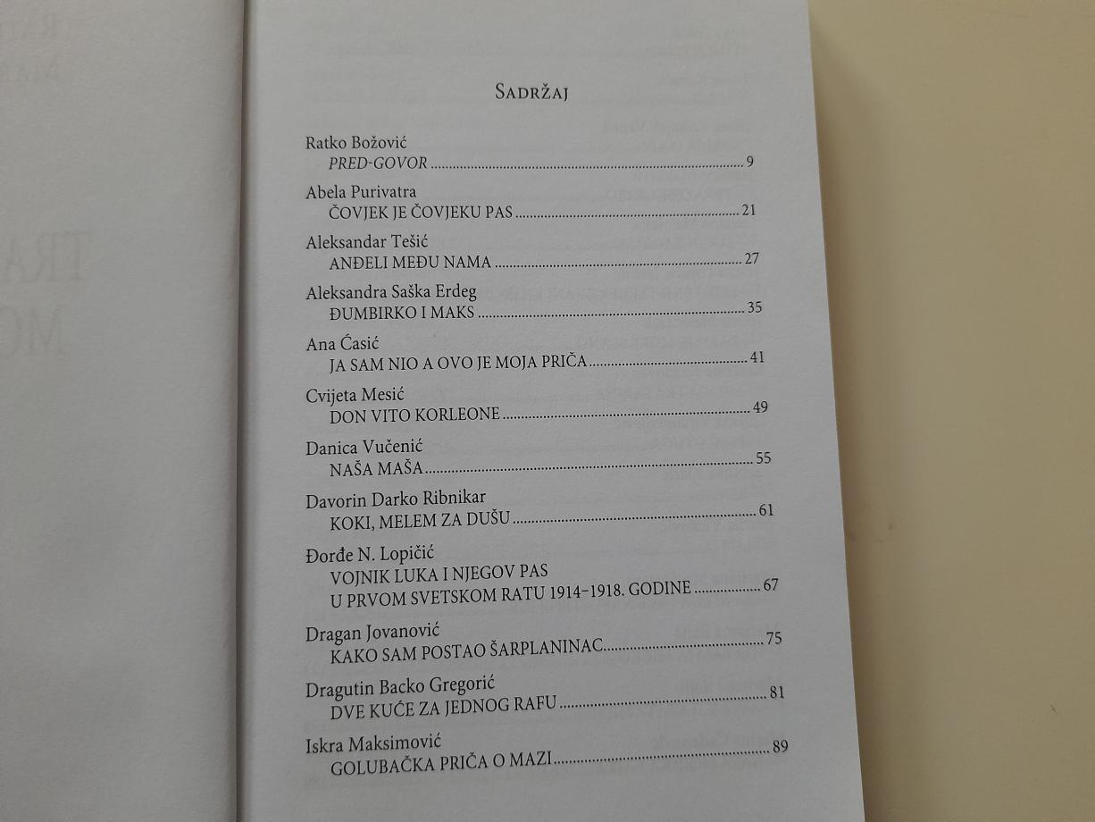 Koautori, uz bezrezervnu podršku i jednaku zaslugu autora novih priča iznova poručuju da je uloga pasa u našim životima ne samo pitanje uzajamne razmene emocija već i važno pitanje urbaniteta uz realan osvrt na stanje u društvu. Novinari, lekari, profesori univerziteta, glumci, književnici, umetnici, veterinari, sportisti, zaštitari životinja i drugi, opet su na zajedničkom zadatku. Svako na svoj način uz mnogo ljubavi, iskrenosti i posvećenosti, kao najvažnijih sastojaka ovog suživota. Otkrivajući tragove koje psi u njihovim životima ostavljaju a kojima zajedno koračaju, svoje priče pričaju: Danica Vučenić, Vanja Bulić, Mirjana Bobić Mojsilović, Tanja Petrović, Davorin Darko Ribnikar, Dragutin Backo Gregorić, Cvijeta Mesić, Ivana Vrdoljak Vanna, Dragan Jovanović, Aleksandar Tešić, Vanja Milačić, Ivan Tokin i mnogi drugi ljubitelji čovekovog najstarijeg i najvernijeg prijatelja iz životinjskog carstva.