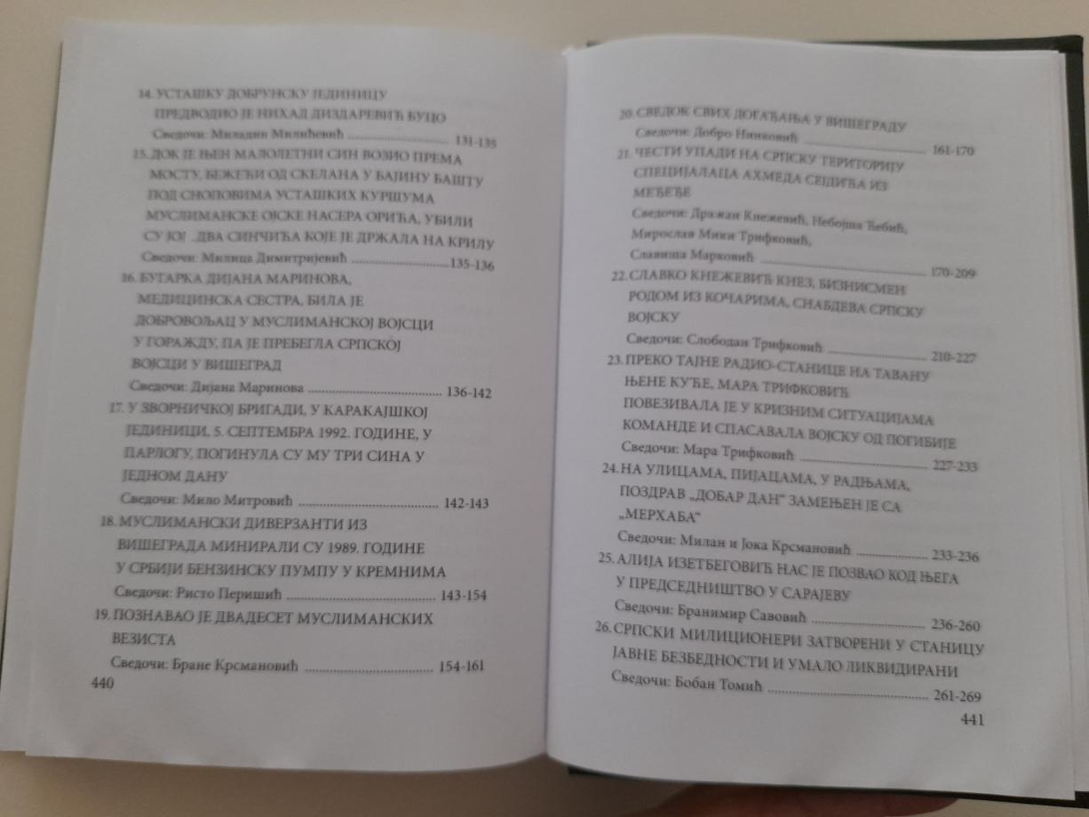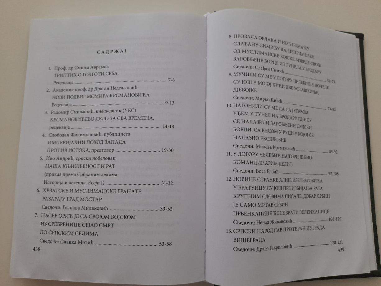 U ovoj knjizi možete pročitati svedočenje Srpkinje Slavke Matić iz okoline Srebrenice, kojoj su muslimanske jedinice pod komandom Nasera Orića ubile muža Radivoja i dve ćerke Snežanu (29) i Gordanu (27)... Zatim svedočenje Mirka Babića koga su u zloglasnom logoru Čelebići mučile dve Hrvatice - ustašice. Opisano je i spaljivanje 60 srpskih sela u Srebrenici. Zatim razapinjanje srpskog deteta u Goraždu od muslimana. U isto vreme opisano je prihvatanje 2000 hrvatskih izbeglica iz Srednje Bosne na teritoriju Republike Srpske.