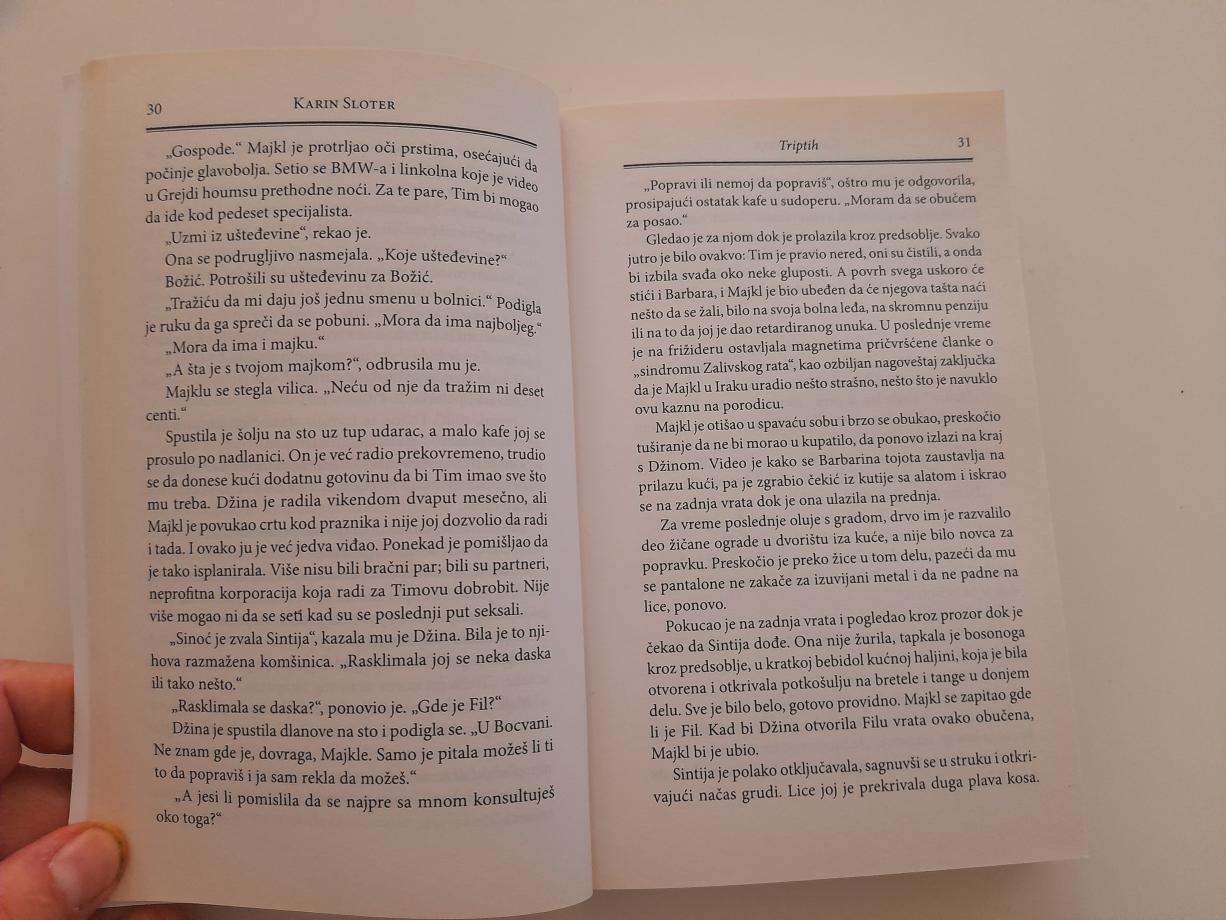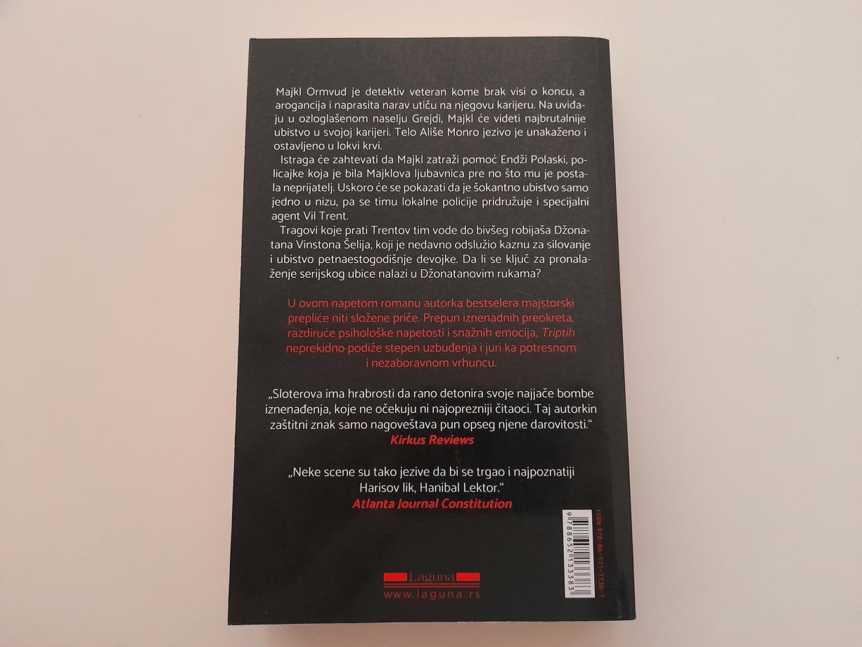U ovom napetom romanu autorka bestselera majstorski prepliće niti složene priče. Prepun iznenadnih preokreta, razdiruće psihološke napetosti i snažnih emocija, Triptih neprekidno podiže stepen uzbuđenja i juri ka potresnom i nezaboravnom vrhuncu.