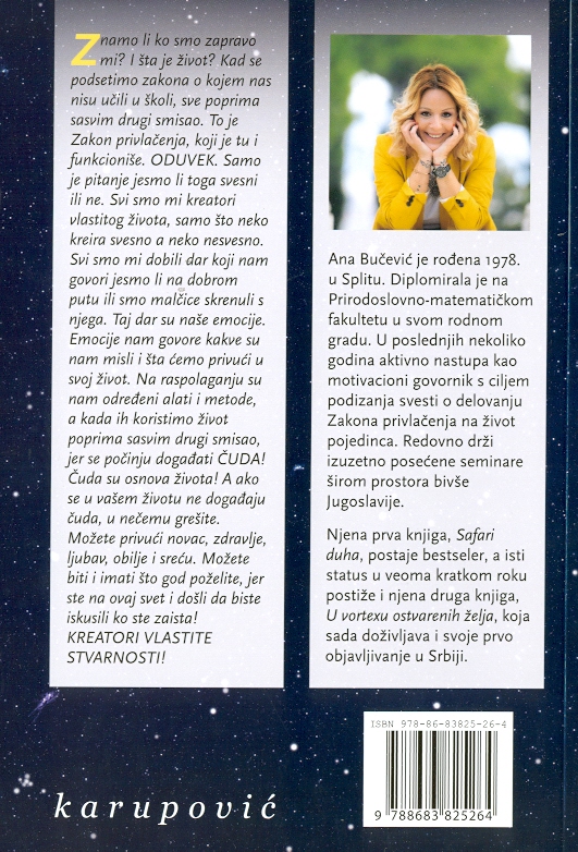 Prof. Ana Bučević veruje da je svako kovač svoje sreće i da svako može uticati na sopstveni život pomoću Zakona privlačenja. Ona smatra da svi mi svesno ili nesvesno kreiramo našu stvarnost i uvek možemo uz pomoć emocija kao vodilja da promenimo svoje misli ili ih usmerimo u pravom smeru. Važno je birati na šta ćemo misliti, a emocija nam govori šta ćemo privlačiti jer su emocije manifestacije misli.