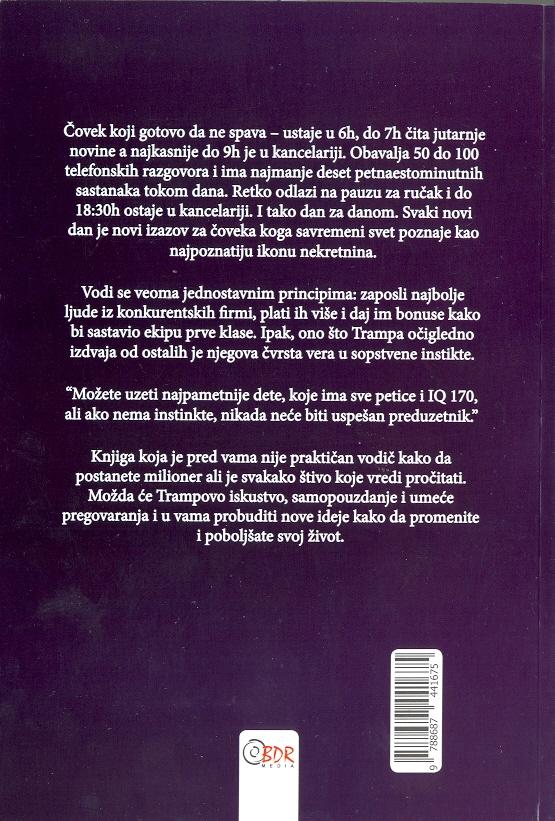 Knjiga koja je pred vama nije praktičan vodič kako da postanete milloner ali je svakako štivo koje vredi pročitati. Možda če Trampovo iskustvo, samopouzdanje i umeće pregovaranja i u vama probuditi nove ideje kako da promenite i poboljšate svoj život