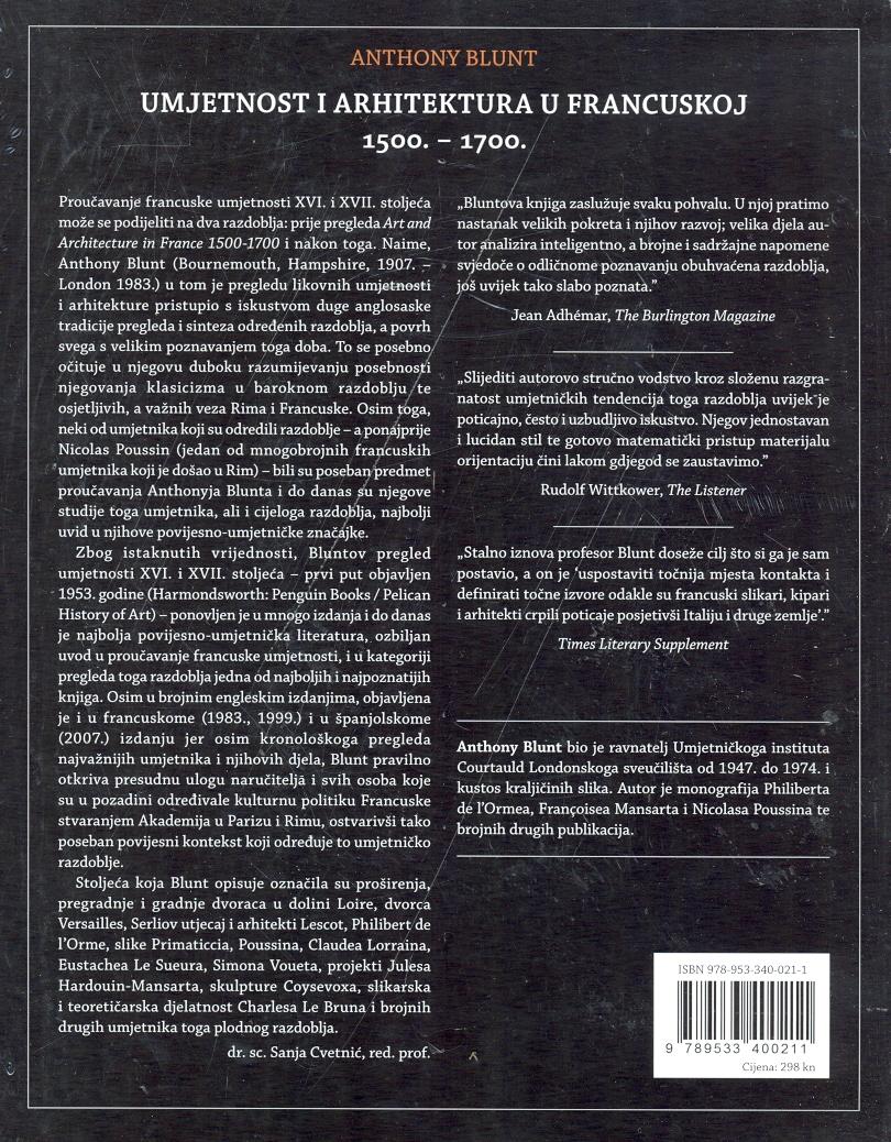 Knjiga „Umjetnost i arhitektura u Francuskoj 1500–1700“ autora Anthonyja Blunta jedno je od najznačajnijih i najuticajnijih dela posvećenih umetnosti ranog novog veka, koje se već decenijama smatra nezaobilaznim štivom u istoriografiji likovnih umetnosti. Ovaj izuzetno informisan i metodički precizan pregled francuske umetnosti i arhitekture XVI i XVII veka nastao je u okviru čuvene serije Pelican History of Art i prvi put je objavljen 1953. godine, ali do danas nije izgubio svoju stručnu i akademsku relevantnost. Blunt, istaknuti britanski istoričar umetnosti i poznavalac klasicizma, pristupio je temi sa širokim znanjem i iskustvom iz anglosaksonske tradicije sinteze umetničkih epoha, a ono što ovu knjigu izdvaja jeste njegovo duboko razumevanje specifičnosti francuskog klasicizma razvijenog u okviru barokne epohe i njegove višeslojne povezanosti s italijanskim, naročito rimskim, kulturnim modelima.