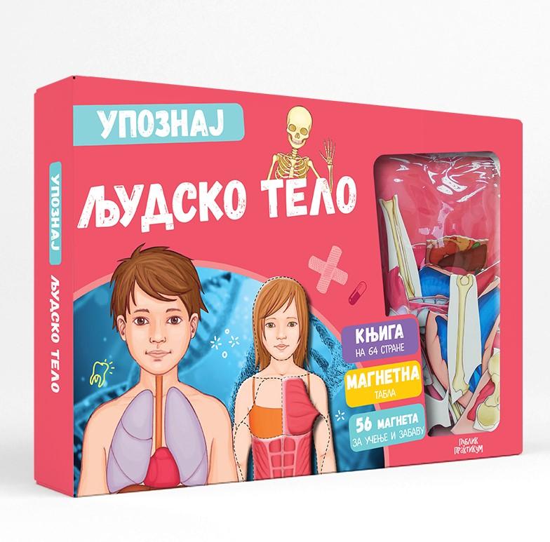 Upoznaj ljudsko telo objašnjava anatomiju čoveka, a zajedno s knjigom ide i magnetna ploča sa 58 magnetnih delova za sastavljanje organa, skeleta, mišića, zuba i srca.