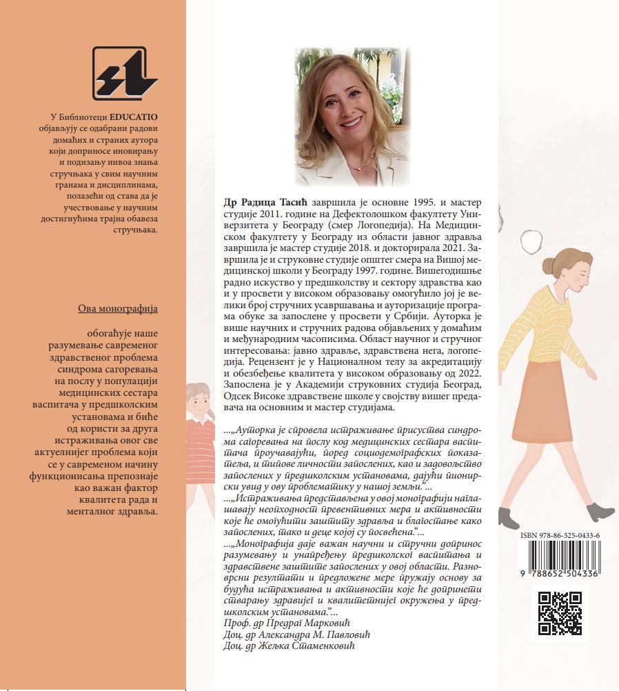 Sindrom sagorevanja predstavlja stanje fizičke, emocionalne i mentalne iscrpljenosti izazvane dugotrajnim izlaganjem emocionalno zahtevnim situacijama na poslu. Rad sa malom decom može biti veoma stresan, zbog čega medicinske sestre – vaspitači predstavljaju visoko rizičnu grupu za razvoj sindroma sagorevanja na poslu. U ovom istraživanju ispitana je prevalenca sindroma sagorevanja na poslu kod medicinskih sestara - vaspitača u beogradskim predškolskim ustanovama, procenjene su psihometrijske karakteristike opšteg upitnika sagorevanja na poslu (MBI-GS) i ispitani prediktori sindroma sagorevanja, kao i značaj karakteristika ličnosti za razvoj ovog sindroma.