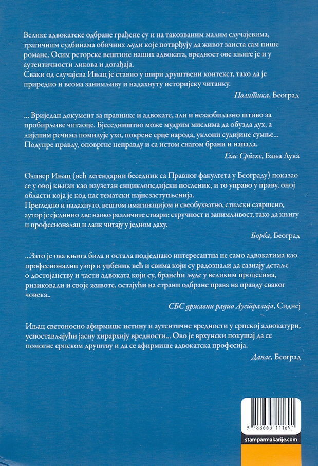 Zanimljiva za svakog čitaoca, a od koristi za one koji žele ili su se već posvetili najkontroverznijoj profesiji, profesiji advokata. Posebno je preporučujemo studentima prava, jer će ona popuniti jednu prazninu u našem sistemu obrazovanja, koje sadrži mnogo teorije, a malo praktičnih znanja. Pored toga, ona je ogledalo jedne stare i cenjene osobine ljudskog roda, a to je veština leporečja.