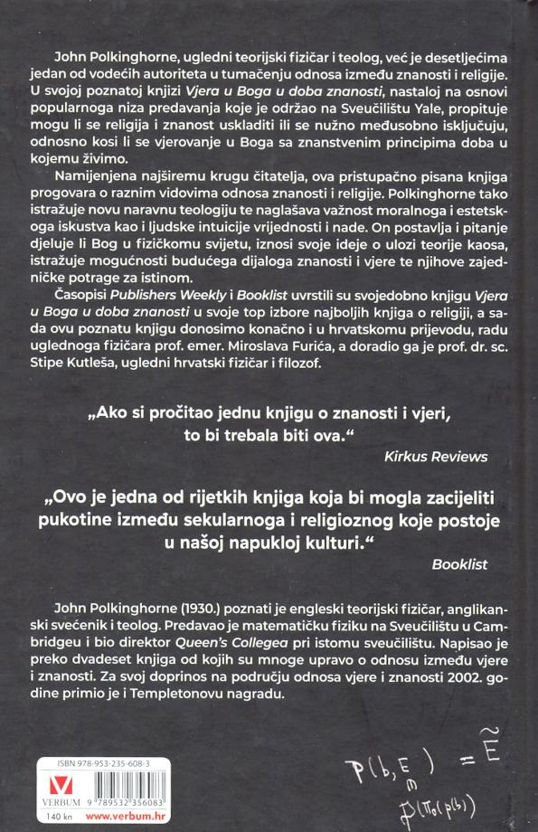 Časopisi Publishers Weekly i Booklist uvrstili su svojedobno knjigu Vjera u Boga u doba znanosti u svoje top izbore najboljih knjiga o religiji, a sa¬da ovu poznatu knjigu donosimo konačno i u hrvatskomu prijevodu, radu uglednoga fizičara prof. emer. Miroslava Furića, a doradio ga je prof. dr. sc. Stipe Kutleša, ugledni hrvatski fizičar i filozof.
