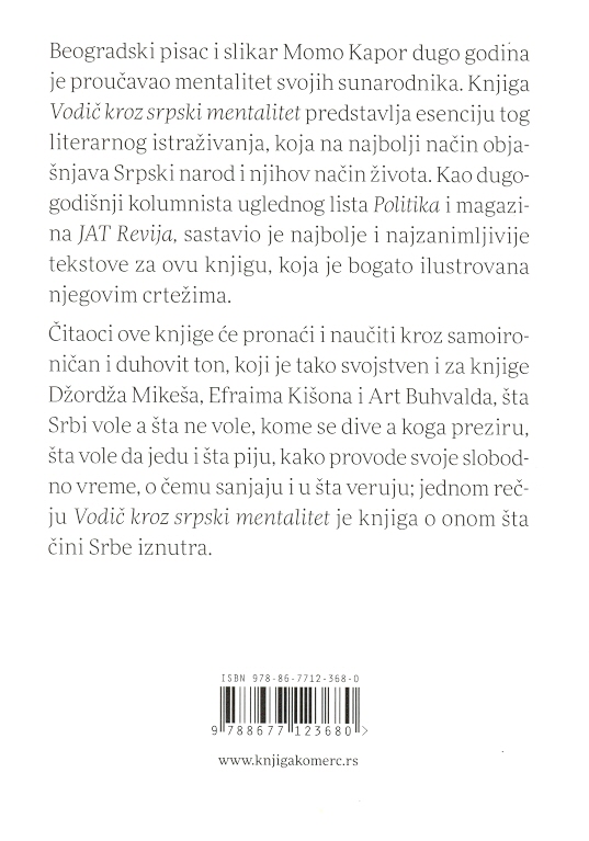 Beogradski pisac i slikar Momo Kapor dugo godina je proučavao mentalitet svojih sunarodnika. Knjiga Vodič krozsrpski mentalitet predstavlja esenciju tog literarnog istraživanja, koja na najbolji način obja- šnjava Srpski narod i njihov način života. Kao dugogodišnji kolumnista uglednog lista Politika i magazi- na JAT Revija, sastavio je najbolje i najzanimljivije tekstove za ovu knjigu, koja je bogato ilustrovana njegovim crtežima.