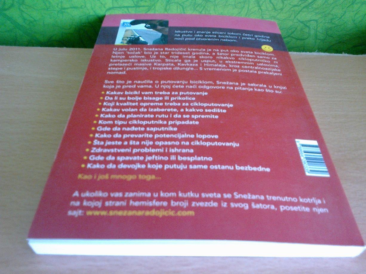 U julu 2011. Snežana Radojičić je krenula na put oko sveta biciklom. Njen ’točak’je bio star trideset godina, a šator predviđen samo za letnje uslove. Uz to, nije imala skoro nikakvo cikloputničko ni kampersko iskustvo. Sticala ga je usput, u ekstremnim uslovima, prelazeći masive Karpata, Kavkaza i Himalaja, kroz centralnoazijske stepe i pustinje, i tropske džungle… S vremenom je postala prekaljeni nomad.