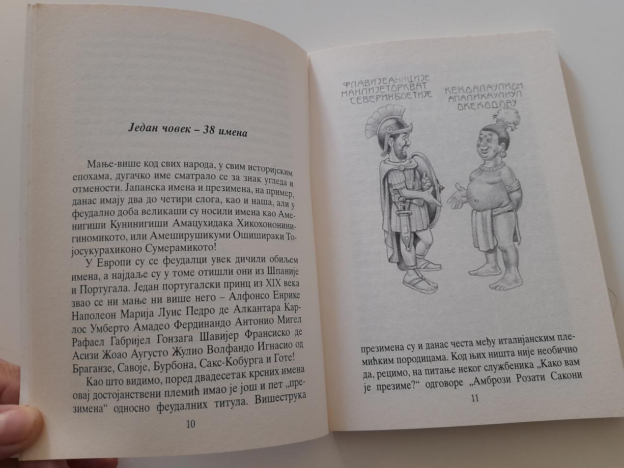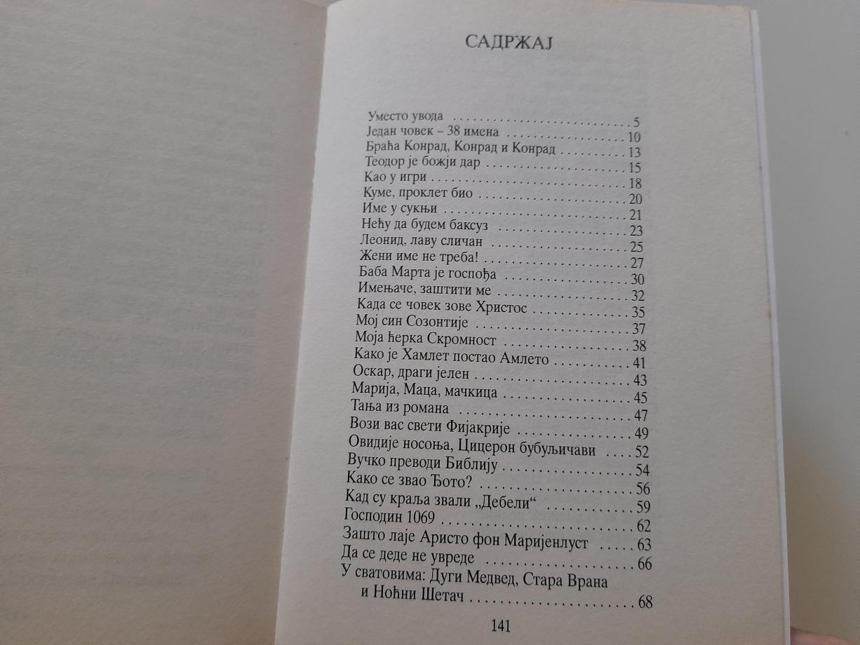Imena lepa, ružna, smešna, imena predugačka i skraćenice umesto imena, imena u modi i tabu-imena... mitološka, svetačka, plemićka, robovska, indijanska, imena životinja, imena od milošte - u ovoj knjizi Ivan Klajn piše o ovim i drugim imenima - zanimljivo, duhovito i mudro. Knjiga za jezičke sladokusce!