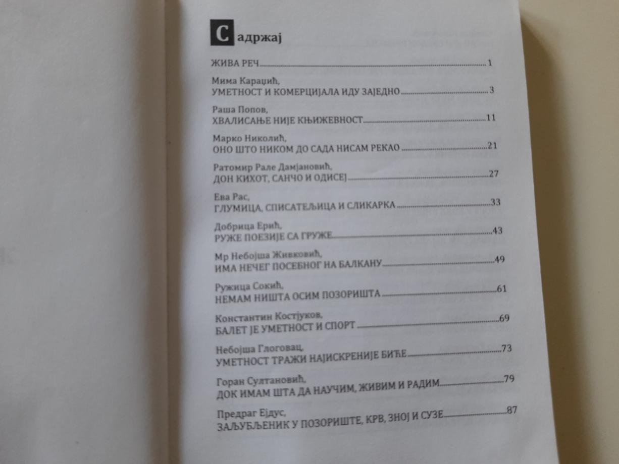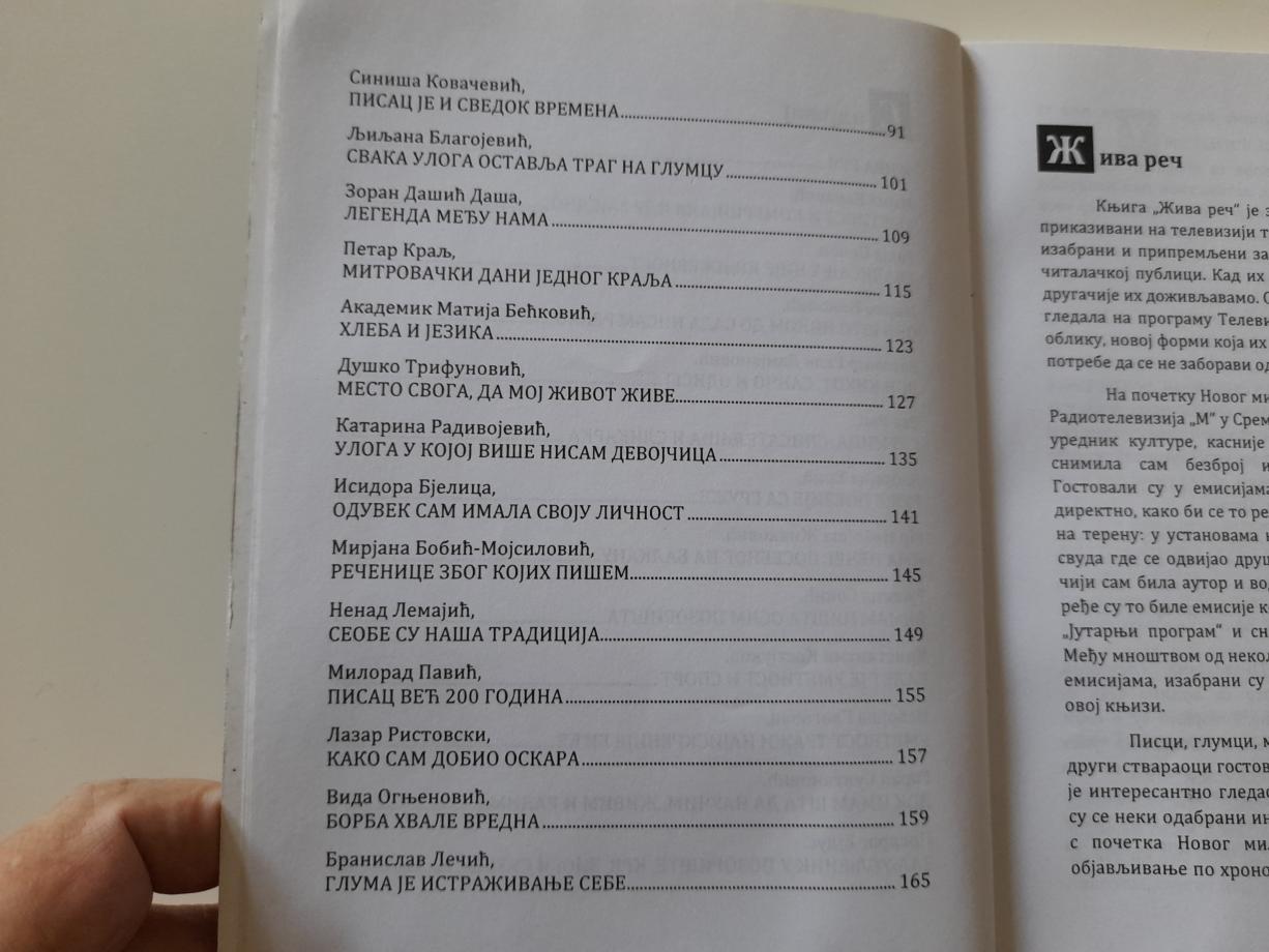Knjiga „Živa reč“ je zbirka intervjua koji su stvarani i prikazivani na televiziji tokom više od jedne decenije, pa izabrani i pripremlјeni za objavlјivanje u formi prilagođenoj čitalačkoj publici. Tako se u knjizi našlo 26 stvaralaca iz oblasti umetnosti, kulture i nauke koji su imali šta da kažu, posebno ono što nikom do tada nisu rekli, a to je zabeleženo na video-trakama i potom pretvoreno u pisanu, štampanu i zauvek zapečaćenu, dostupnu uvek onima koji su znatiželјni i radoznali, onima koji istražuju i žele da se bave ličnostima što su obeležile svojim životom i delom XX vek i početak novom trećeg milenijuma.