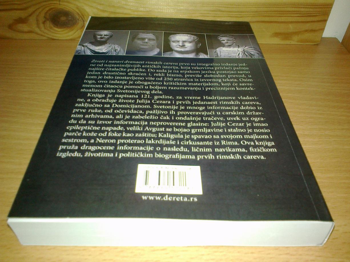 Pred vama se nalazi knjiga Životi i naravi dvanaest rimskih careva (De vita Caesarum), prvo integralno izdanje jedne od najzanimljivijih antičkih istorija, koja vekovima privlači pažnju najšire čitalačke publike. Do sada je na srpskom jeziku postojao samo jedan drastično skraćeni i, rekli bismo, previše slobodan prevod, u kom je bilo izostavljeno više od 250 stranica iz izvornog teksta. Osim toga, ovo izdanje je obogaćeno kritičkim materijalom, koji će savremenom čitaocu pomoći u boljem razumevanju i preciznijem kontekstualizovanju Svetonijevog dela.
