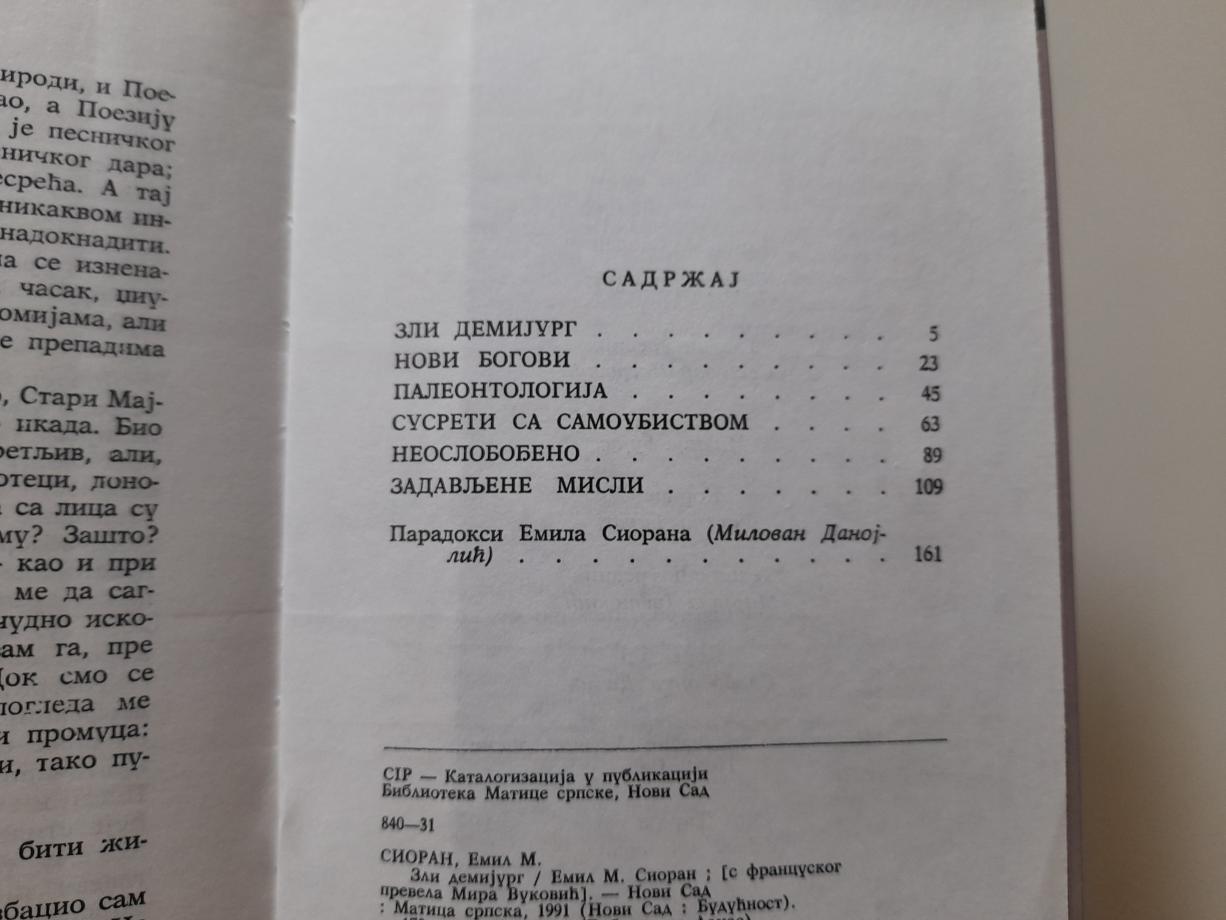 Emil Sioran, jedan od najznačajnijih filozofa i esejista XX veka, čuven je po svom duboko pesimističkom i fatalističkom poimanju sveta. Iako se uporno trudio da ostane izvan društvenih tokova, odbijajući većinu zahteva za intervjue, kao i brojne nagrade, retki su oni koji su tako duboko i analitično promišljali to isto društvo, čovekovu egzistenciju i duh tadašnjeg vremena. Zajedno sa svojom ženom živeo je u potpunoj izolaciji u Latinskoj četvrti u Parizu, zauzevši tako, u odnosu na svet, onu distancu koja je neophodna da bi se taj svet istinski sagledao. Mračan pogled skeptika na paradoks našeg postojanja može se svesti na ovu njegovu misao: Svi smo mi na dnu pakla čiji je svaki trenutak pravo čudo.
