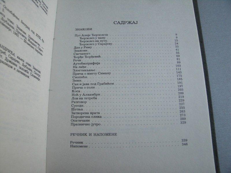 Znakovi“ su Andrićeva priča iz savremenog života, napisana u smeni trećeg i prvog pripovednog lica, a prvi put objavljena 1951. godine. Počinje relativno brzim uvodom, koji vodi do središnjeg toka pripovedanja. Objektivni pripovedač opisuje tugu palanačkih hotela. Jedne večeri u jednom takvom hotelu sreo je izvesnog profesora V. koji mu je ispričao jednu priču. Objektivni pripovedač je psiholog, objavljuje radove u Psihološkoj reviji, profesor V. ga prepozna, priđe mu i tako otpočne razgovor koji će onoga trenutka kada se u njemu dotaknu žena pretvoriti u dugi, zagrcnuti monolog. Profesor V. priča, ne bez znakova skretanja od normale, o nesporazumu koji je doživeo sa jednom ženom. Profesor V. sebe vidi kao čestitog, odmerenog i uvek pristojnog čoveka, što se naročito potvrđuje u njegovom odnosu prema ženama, tačnije, u nepostojanju takvih odnosa.