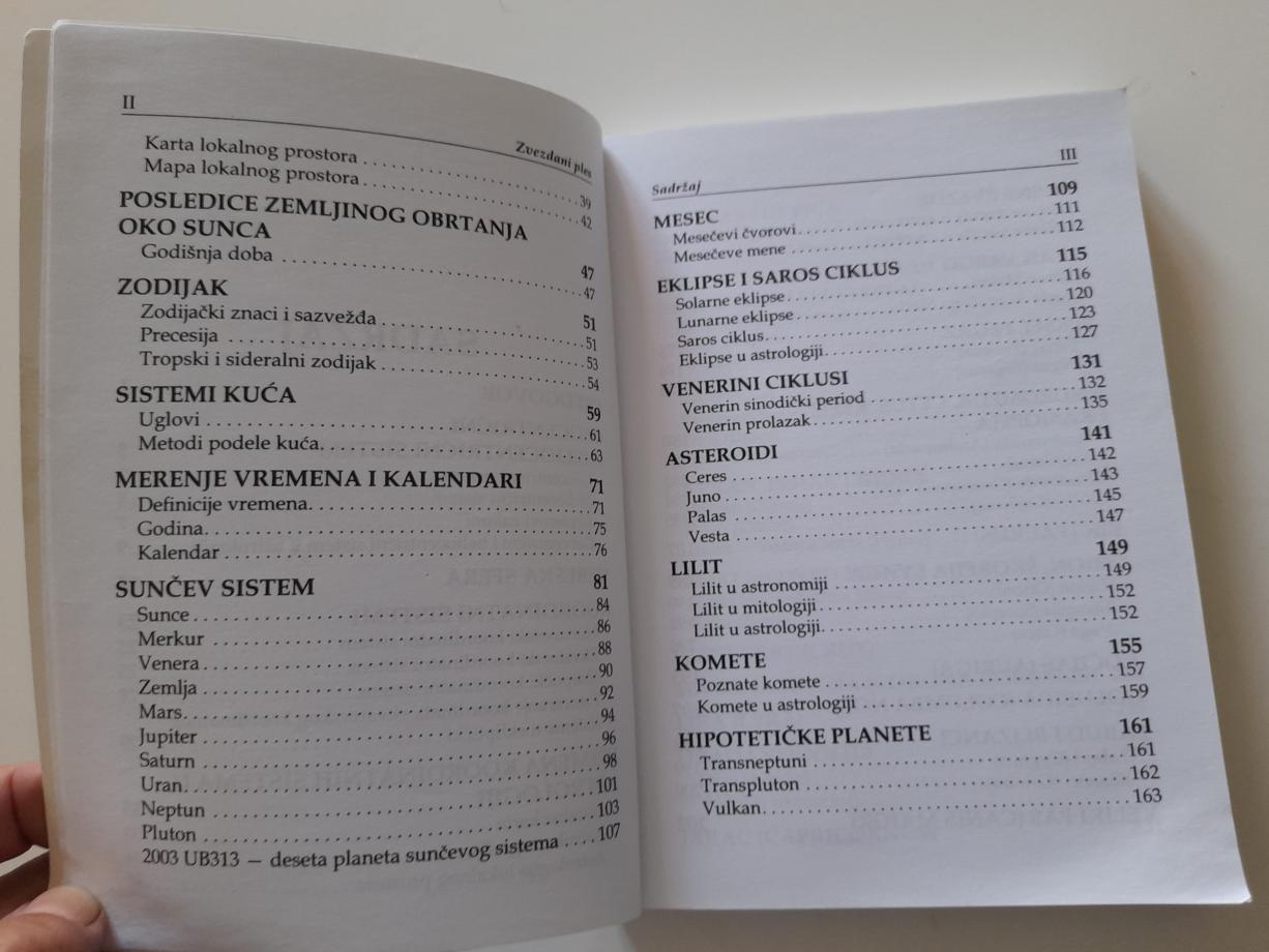 Obuhvaćeni su različiti pojmovi, nebeski objekti i događaji sa astronomske, ali i sa mitološke i astrološke strane. Sunčev sistem, asteroidi, sazvežđa, eklipse, ciklusi, koordinatni sistemi u astronomiji, sistemi kuća u astrologiji, precesija, kalendar i vremenske zone samo su neke od tema obrađenih u ovoj knjizi.
